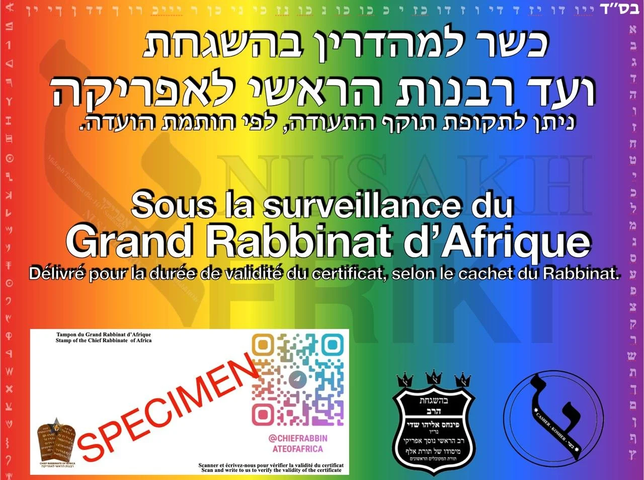 The Kosher – Nusach Afriki certification of the Chief Rabbinate of Africa, under the authority of Chief Rabbi Pinhas Eliyahou SHADAY, is a mark of excellence that reconnects with the oldest and most authentic standards of the Torah Alef.